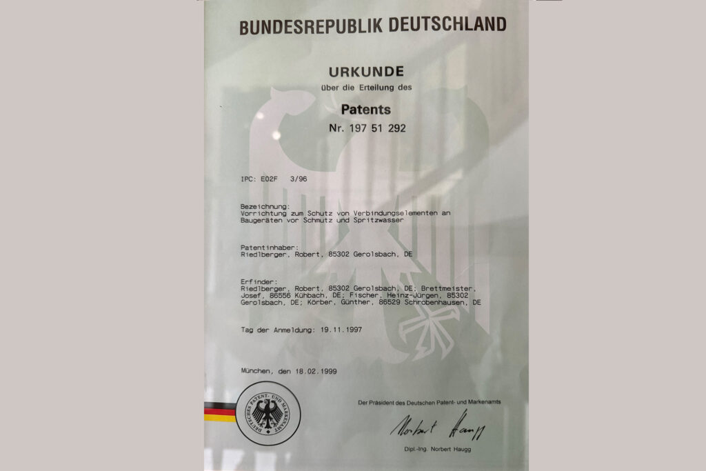 Patent für den ersten vollhydraulischen Schnellwechsler mit automatischem Schmutzschutz, die Geburtsstunde unseres Coupfix.
