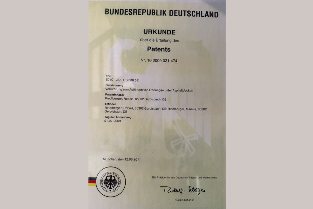 Offizielle Patenterteilung für die innovative Naviplatte zum Auffinden von Schächten unter Asphalt an Robert und Markus Riedlberger.